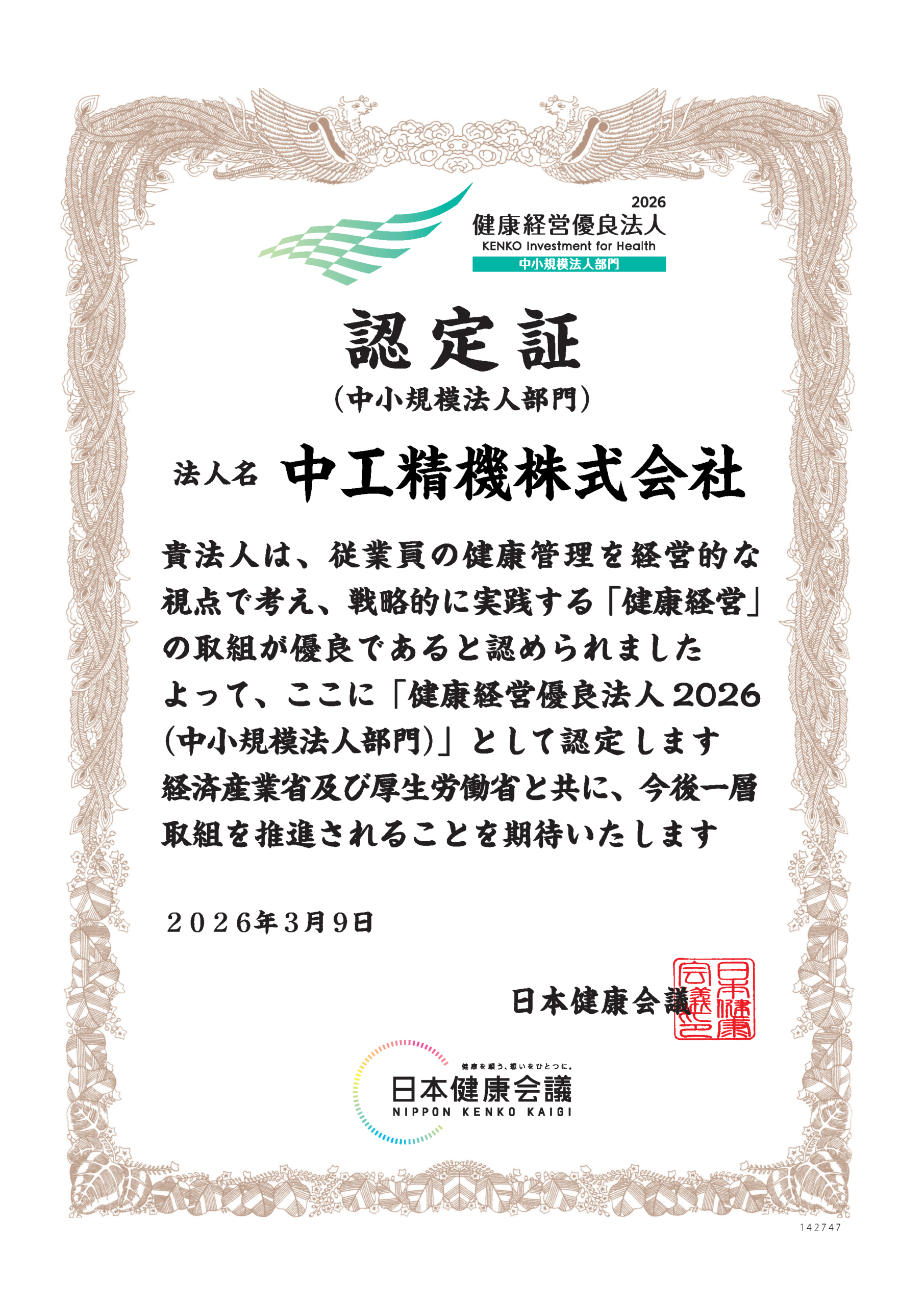中工精機は、従業員の心身の健康づくりと働きやすい職場環境の整備が高く評価され、「健康経営優良法人2026(中小規模法人部門)」として認定されました。