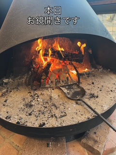 お餅は暖炉で焼きます。担当は会長です。