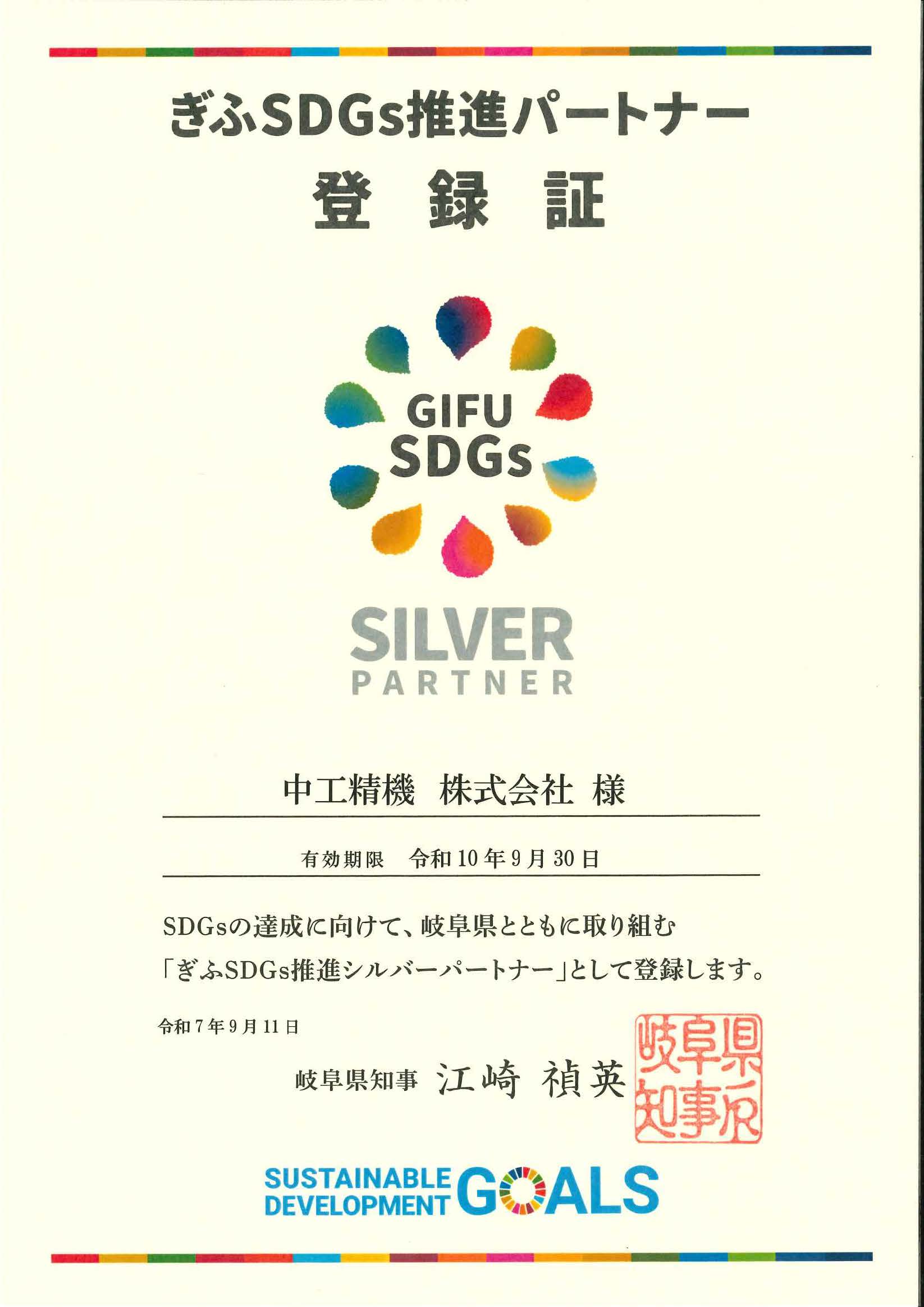 中工精機は、このたび岐阜県が運営する「ぎふSDGs推進パートナー登録制度」において、シルバーパートナーとして登録されました。