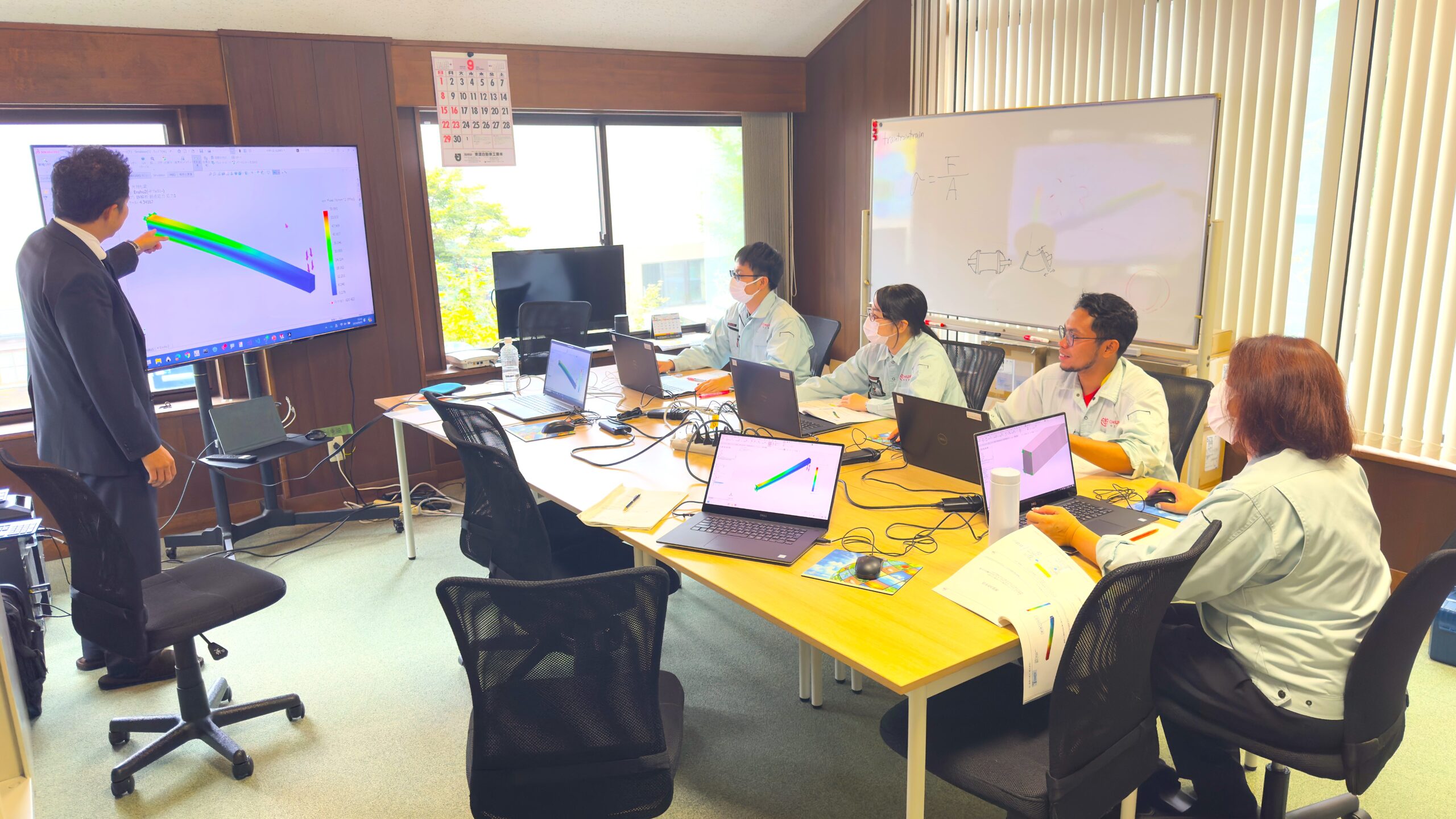 新入社員も増え、SOLIDWORKS Simulation操作の基礎を学ぶため、外部講師の方をお招きし、有限要素法基礎とメッシュについて学習しました。
